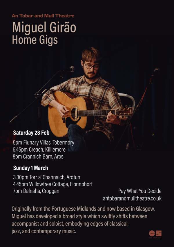 Presented by An Tobar, you can experience the music of Miguel Girão, one of the most technically gifted and expressive guitarists in Scotland, in the intimate setting of six different Mull homes. Locations are spread throughout Mull from Tobermory, Aros, Aros Mains, and Croggan, to Ardtun and Fionnphort.